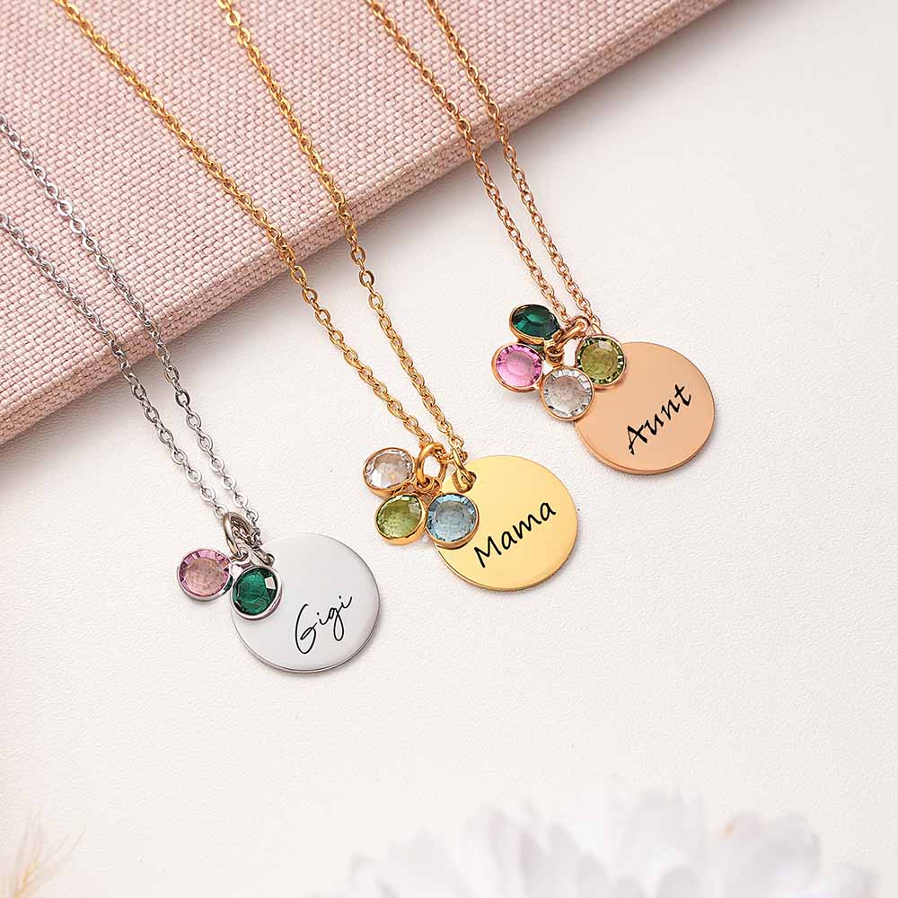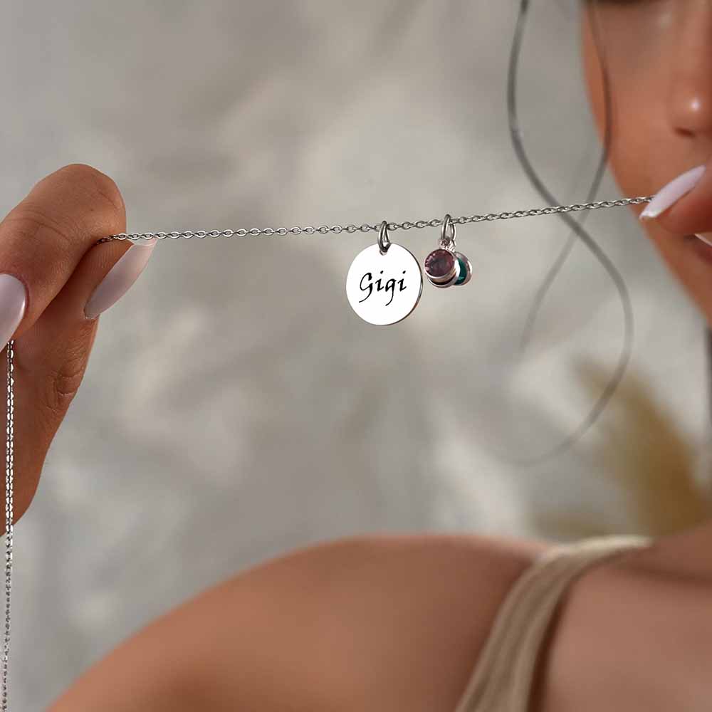 This personalized custom Gigi necklace is a meaningful tribute to motherhood, crafted with custom kids’ names and birthstones to beautifully capture the love and bond between a mother and her children. Each charm represents a child, creating a timeless keepsake she’ll treasure forever.